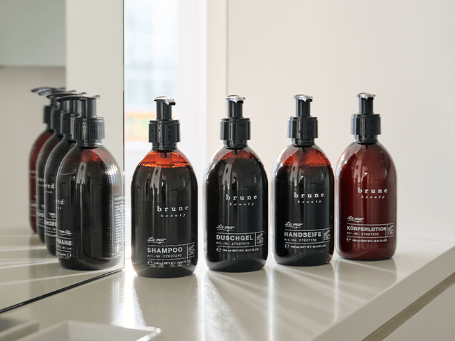 Auch auf Ihrem Zimmer finden Sie die hochwertigen Pflegeprodukte von Brune Nature Beauty & Spa. Diese exklusive Linie ist in Kooperation mit der Naturkosmetikmarke La mer entstanden und enthält nur beste Inhaltsstoffe aus dem Meer. Und sie riecht unvergleichlich gut.